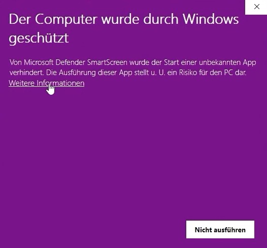 Wir klicken in diesem Fall auf „Weitere Informationen“ und danach auf den neu erscheinenden Button: „Trotzdem ausführen“.