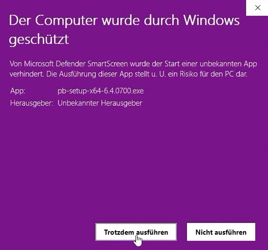 Beim Starten der Installationsdatei wird Windows 10 und 11 einen Warnhinweis zeigen, dass die Software keine Signatur aufweist.