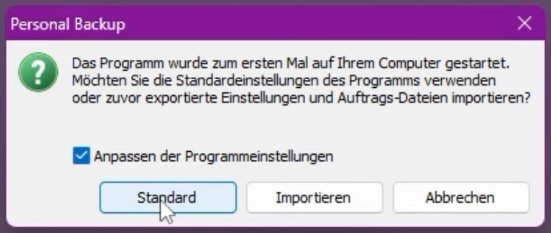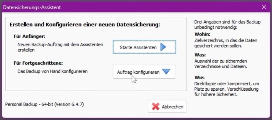 Nach dem erstmaligen Start von Personal-Backup werden wir gefragt, ob wir den Assistenten oder aber eine manuelle Einrichtung vornehmen möchten.