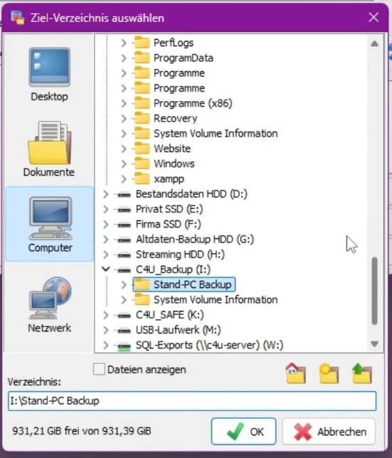 In meinem Beispiel verwende ich mein eingebautes Laufwerk I:\ (C4U Backup).