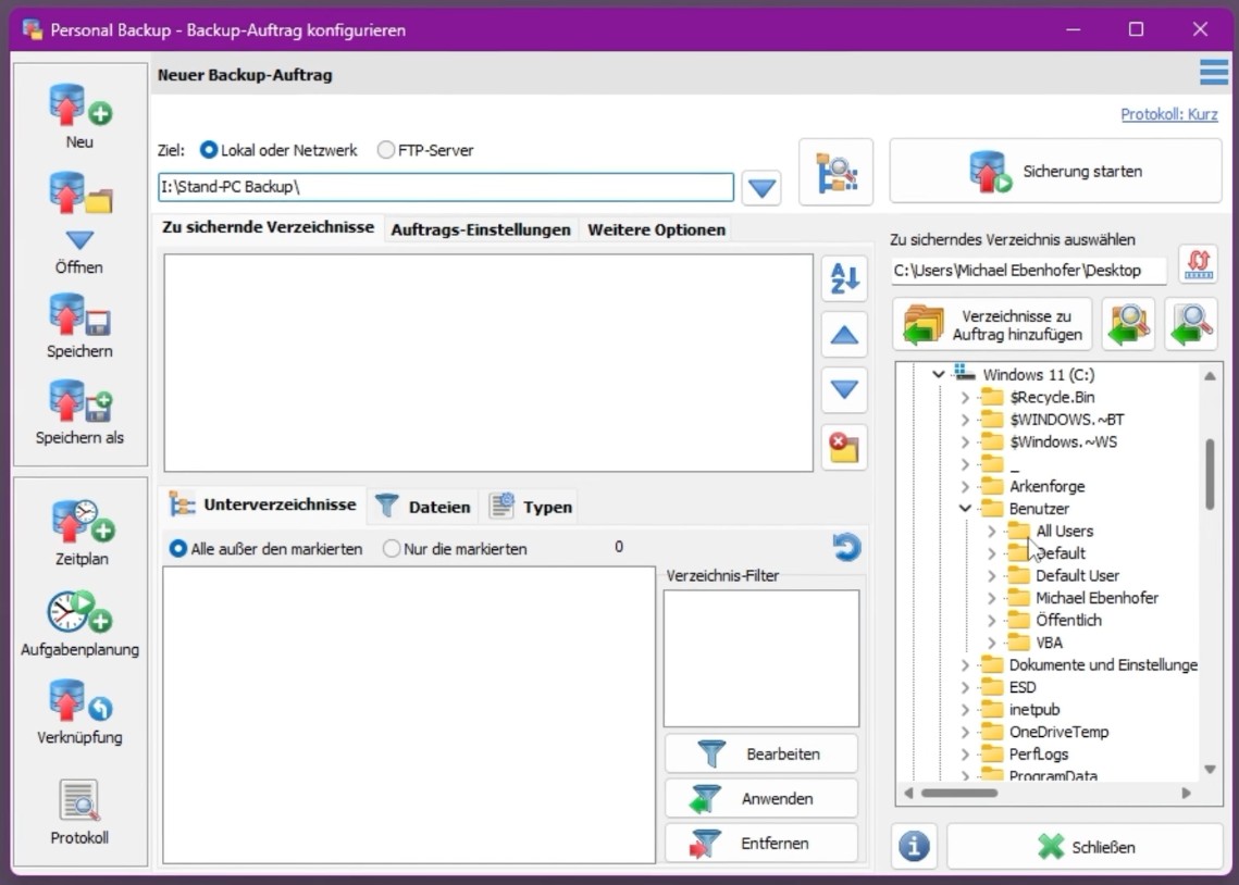 Danach wählen wir im rechten Bereich der Software aus, welche Verzeichnisse wir sichern möchten.
